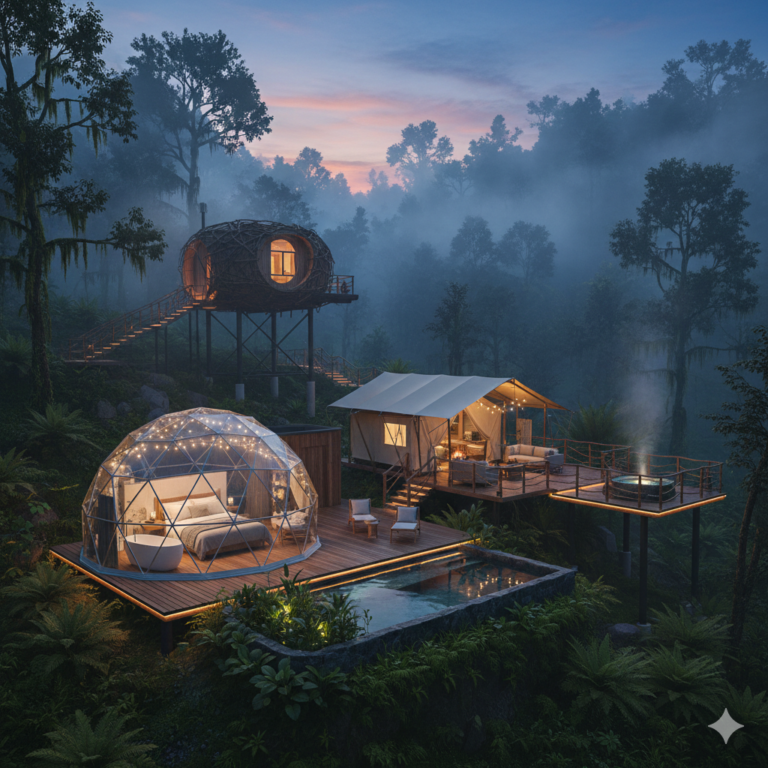 Detalle: Estructuras tensadas de alta resistencia, domos transparentes para observación estelar, plataformas elevadas sobre pilares y diseños tipo «nido» o «burbuja» con vistas 360°.